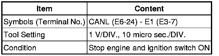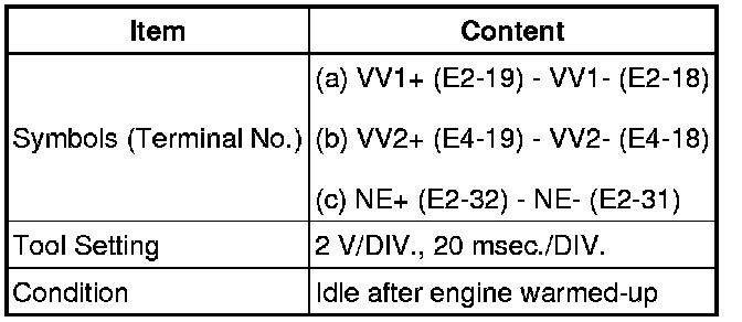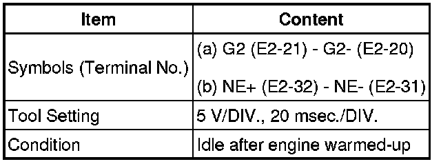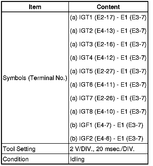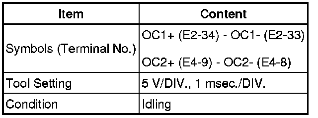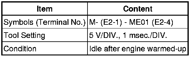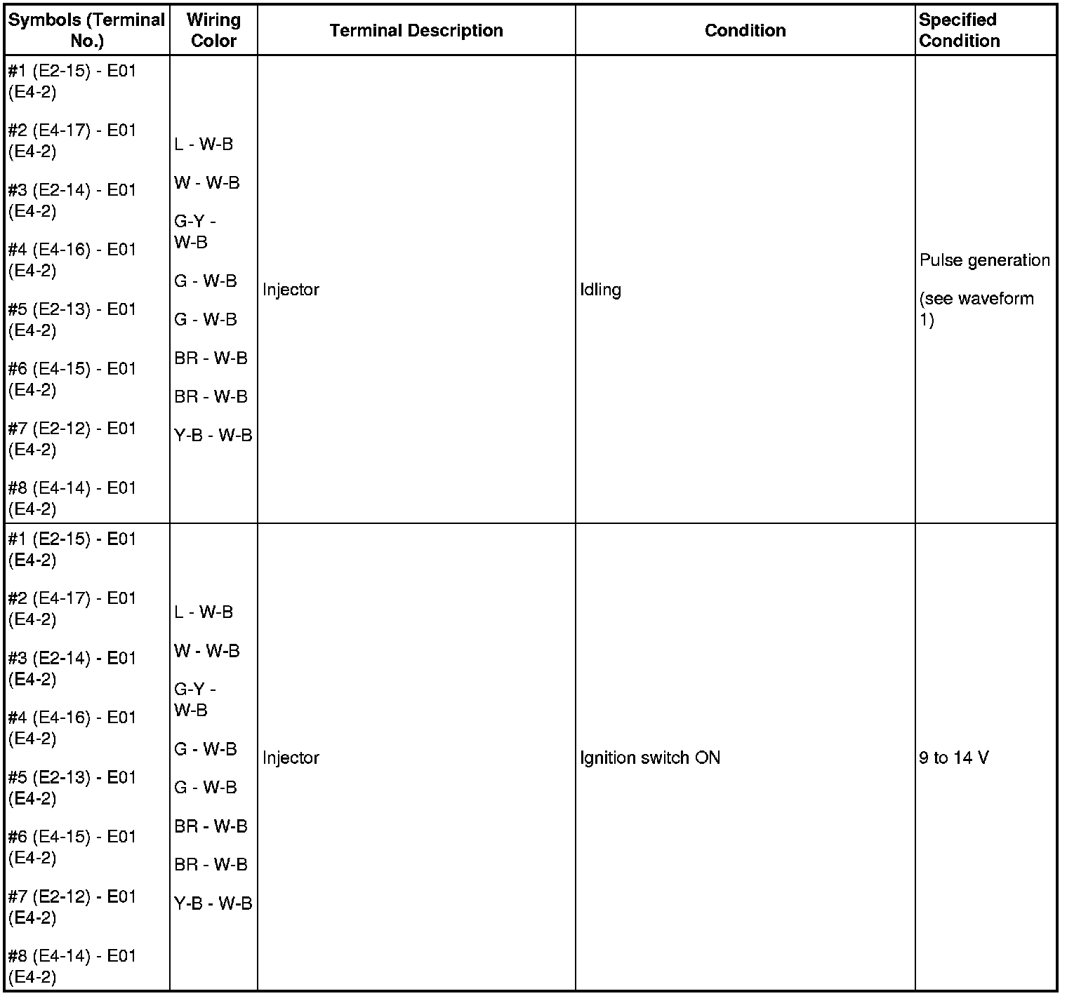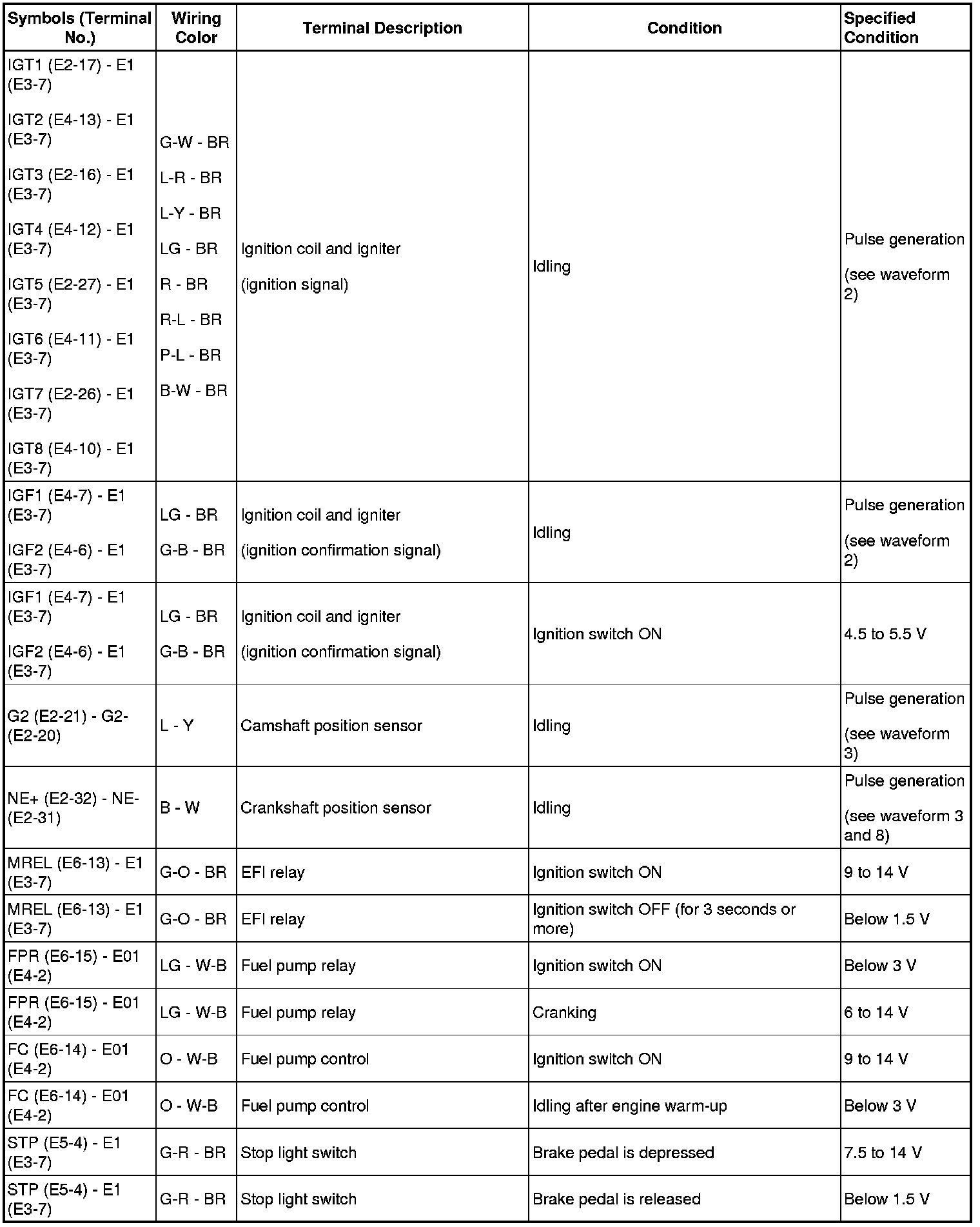 HINT: Each ECM terminal's standard voltage is shown in the table below. In the table, first follow the information under "Condition". Look under "Symbols (Terminal No.)" for the terminals to be inspected. The standard voltage between the terminals is shown under "Specified Condition".