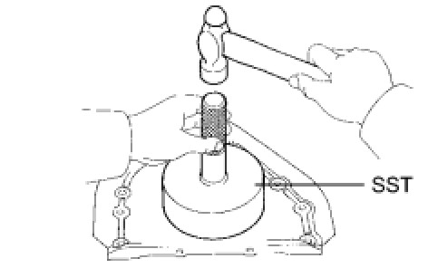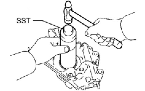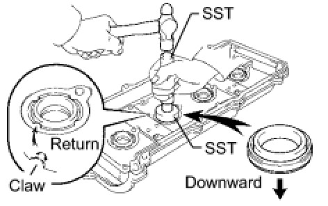 (b) Using SST and a hammer, tap in a new oil seal until its surface is flush with the oil pump body edge.