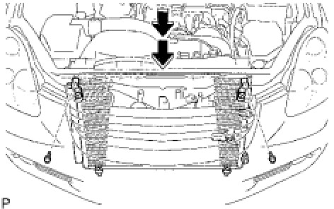 (b) Insert the lower support on the lower side of the cooler condenser into the crossmember.