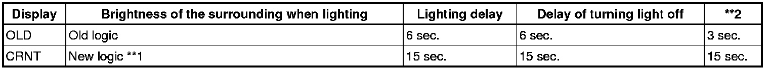 **2: Delay time until the headlight is turned on when it suddenly gets dark.