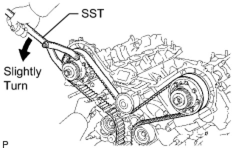 (d) Using SST, loosen the tension between the camshaft timing pulley (RH bank) and crankshaft timing pulley by slightly turning the camshaft timing pulley (RH bank) counterclockwise.