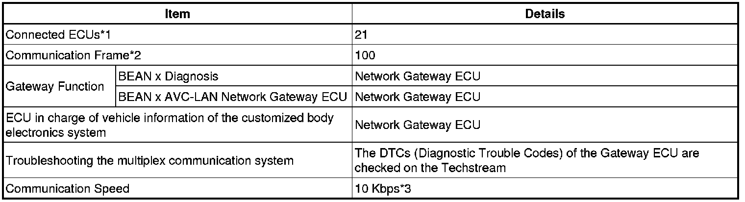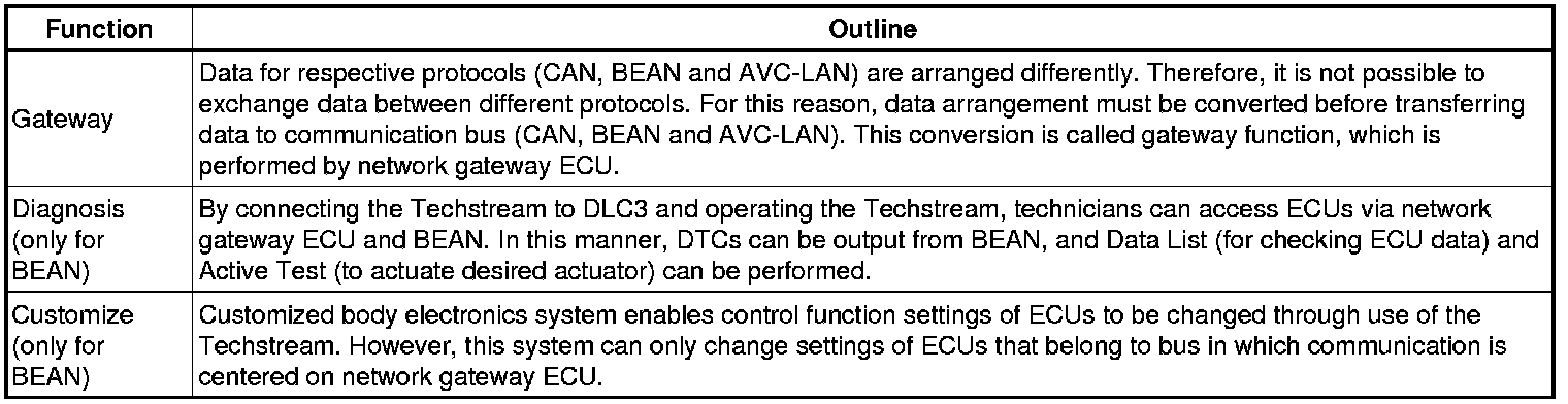 (1) The CAN, BEAN and AVC-LAN protocols have set guidelines for data. The guidelines include communication speed, type of communication wire, drive type and data length. These guidelines are established to facilitate ECU data communication.