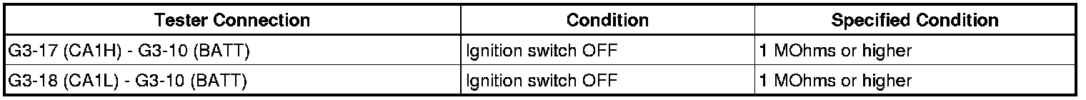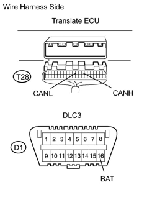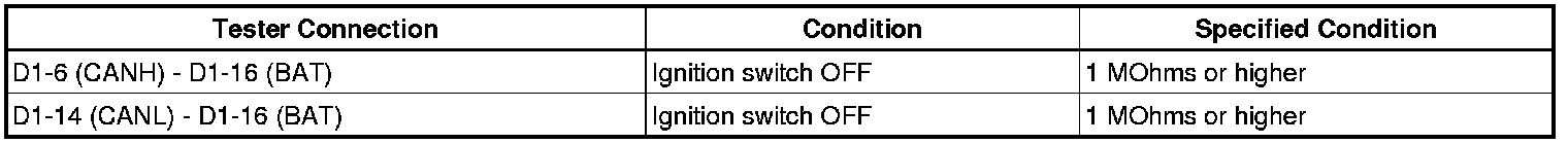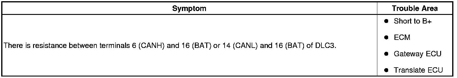 There may be a short circuit between the CAN bus line and B+ when there is resistance between terminals 6 (CANH) and 16 (BAT) or terminals 14 (CANL) and 16 (BAT) of the DLC3.