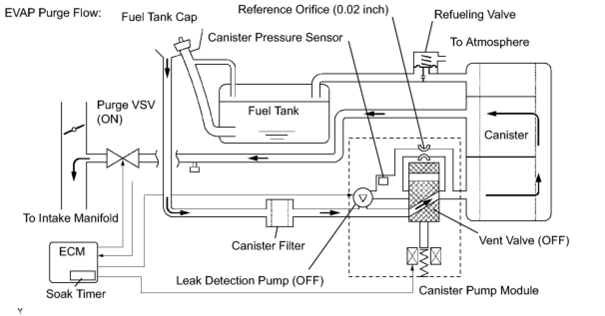 The purge flow volume is also determined by the intake manifold pressure. Atmospheric pressure is allowed into the canister through the vent valve to ensure that the purge flow is maintained when the negative pressure (vacuum) is applied to the canister.