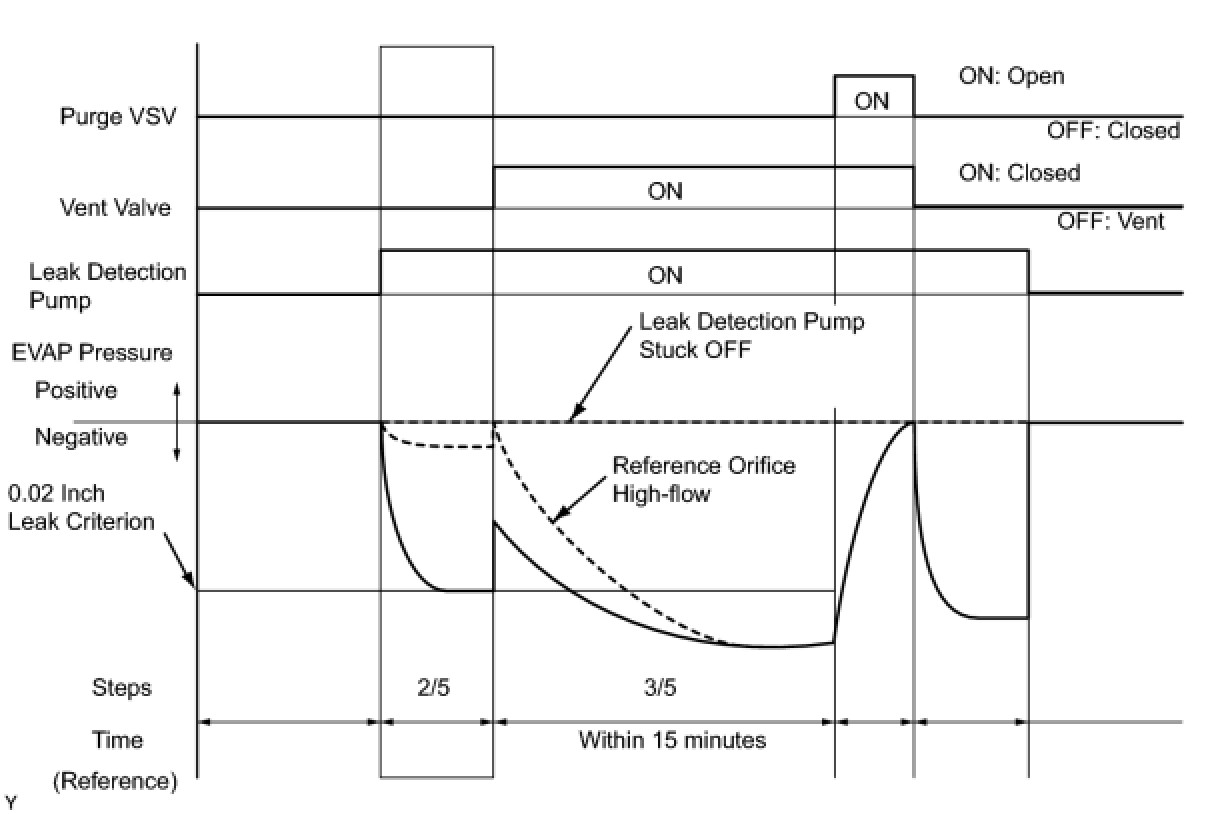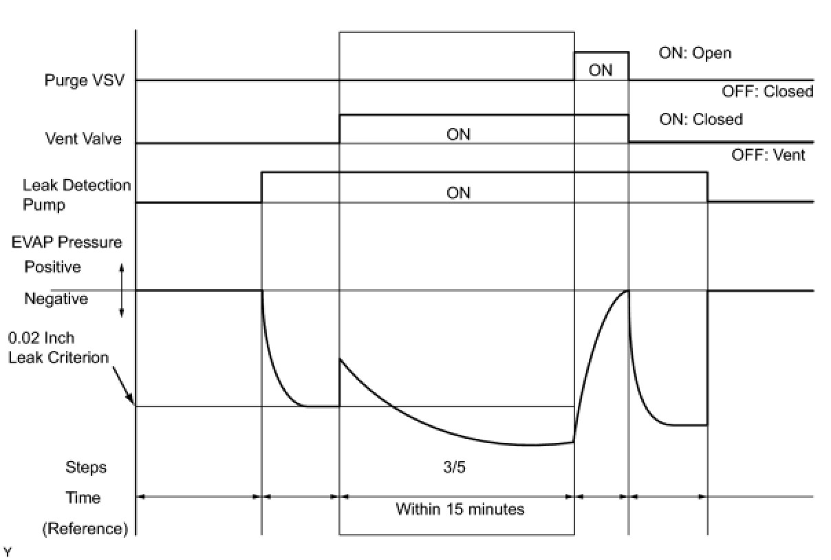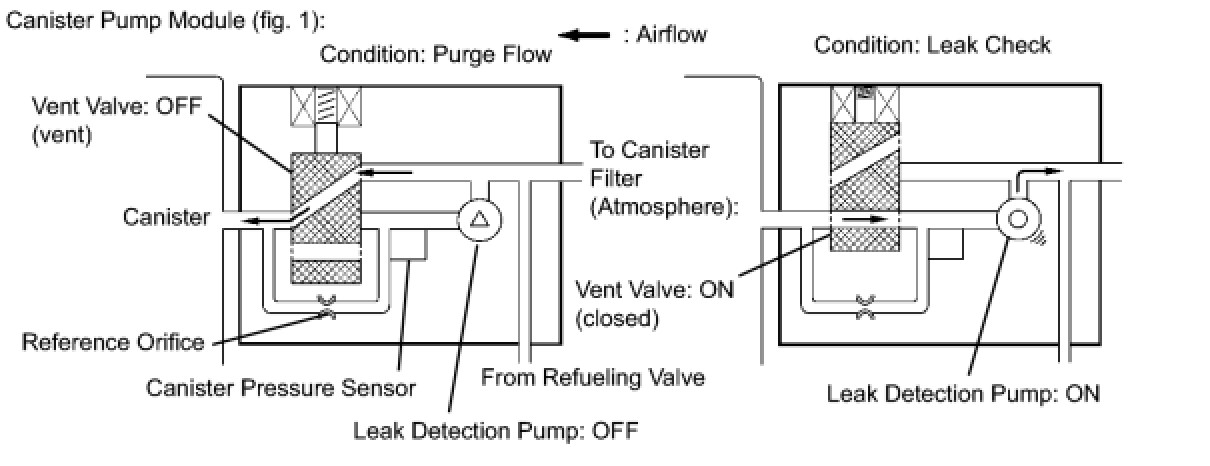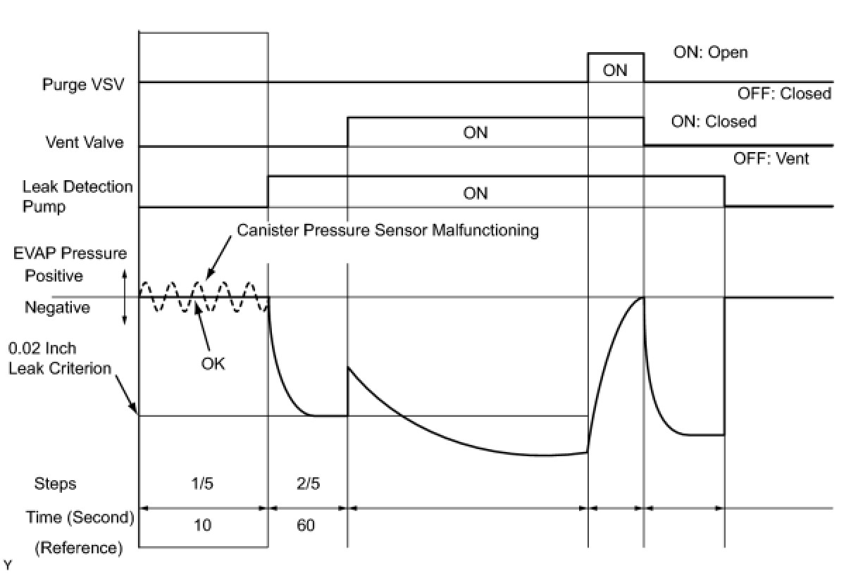 The leak detection pump creates negative pressure (vacuum) in the EVAP system and the pressure is measured. Finally, the ECM monitors for leaks from the EVAP system and malfunctions in both the canister pump module and purge VSV based on the EVAP pressure.
