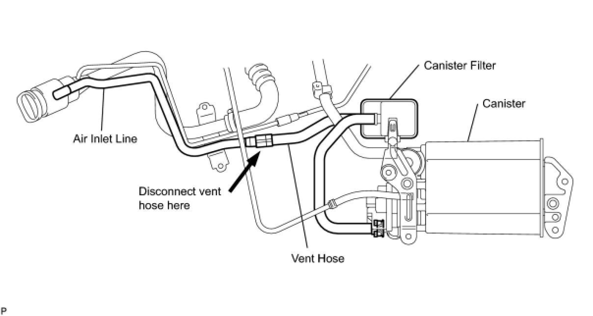 NOTE: In this vehicle's EVAP system, turning ON the vent valve does not seal off the EVAP system. To check for leaks in the EVAP system, disconnect the air inlet vent hose and apply pressure from the atmosphere side of the canister.