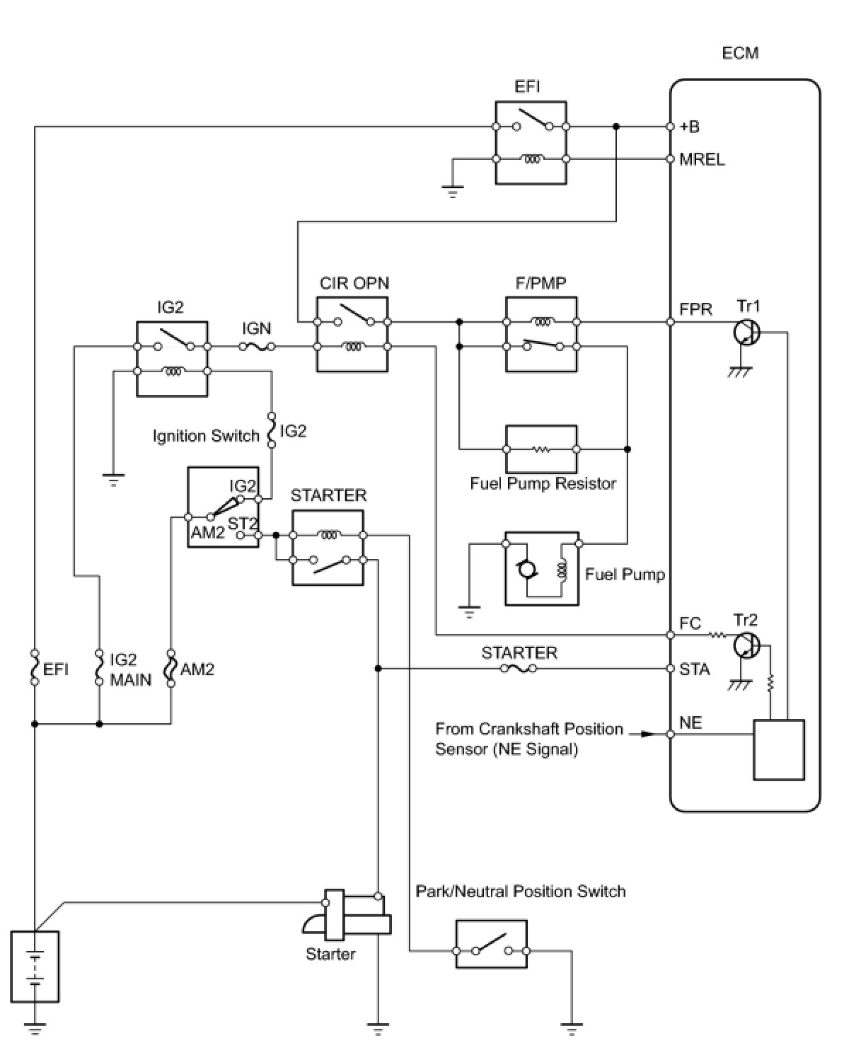 When the engine is cranked, current flows from terminal ST of the ignition switch to the starter relay coil and also current flows to terminal STA of the ECM (STA signal). When the STA signal and NE signal are input to the ECM, Transistor 1 (Tr1) of the ECM is turned ON, current flows to the coil of the circuit opening relay (Marking: CIR OPN), the relay switches on, power is supplied to the fuel pump, and the fuel pump operates. While the NE signal is generated (engine running), the ECM keeps Tr1 ON (circuit opening relay ON) and the fuel pump also keeps operating. The fuel pump speed is controlled at two levels (high speed or low speed) by the condition of the engine (starting, light load, heavy load). The fuel pump operates at high speed when: 1) the engine starts and the STA signal is ON; and 2) Transistor 2 (Tr2) of the ECM is OFF, causing the fuel pump relay (Marking: F/PMP) to close and battery positive voltage to be applied directly to the fuel pump. The fuel pump operates at low speed when: 1) after the engine starts, the engine is idling or has a light load; and 2) since the ECM's Tr2 is ON, battery positive voltage is applied to the fuel pump via the fuel pump resistor.