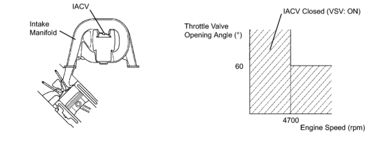 When the engine speed is 4700 rpm or more and the throttle valve opening angle is 60° or more, the IACV is open (VSV: OFF). At all other times, the IACV is closed (VSV: ON).