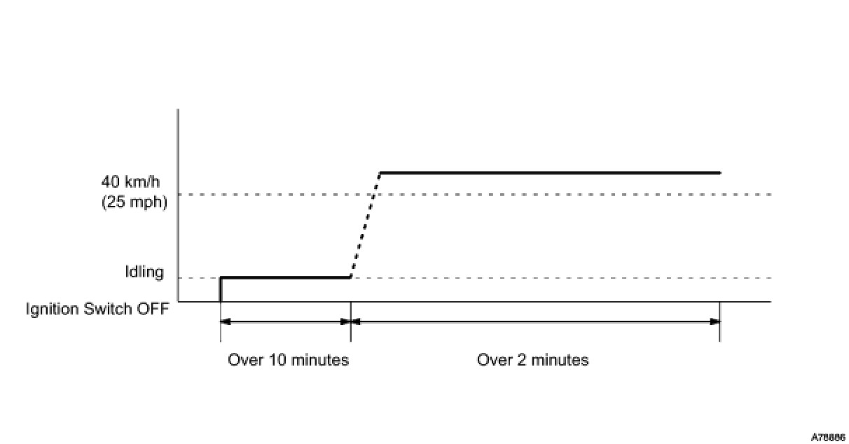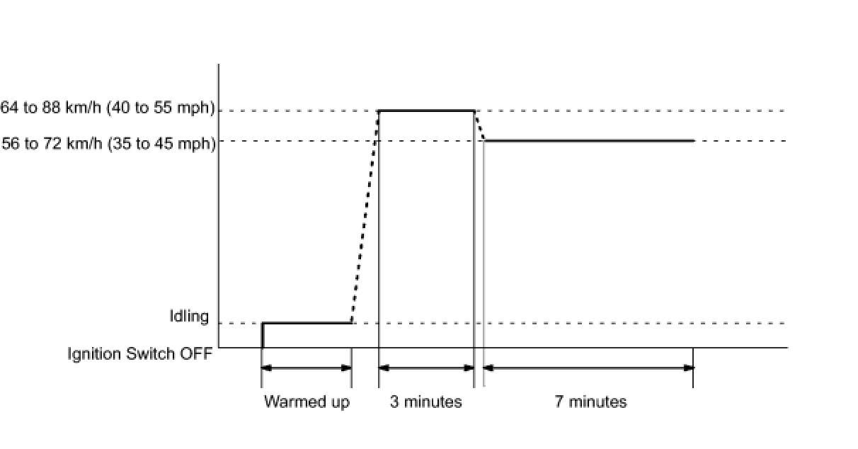 NOTE: Drive with smooth throttle operation and avoid sudden acceleration. If IAT was less than 10°C (50°F) when the engine was started, drive the vehicle at 64 to 88 km/h (40 to 55 mph) for an additional 3 minutes.