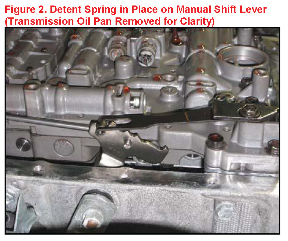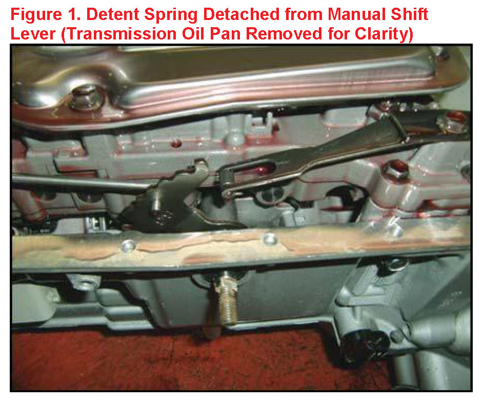 - If the detent spring becomes detached from the manual shift lever, remove the detent spring and reinstall on the manual shift lever. See Figures 1 and 2.