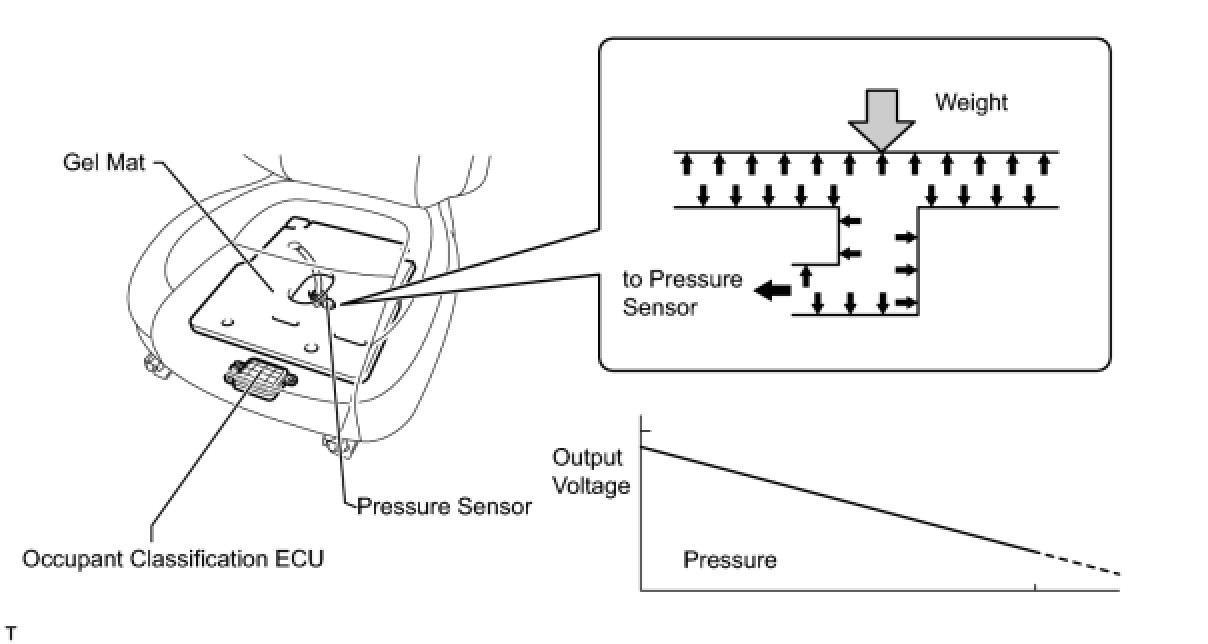 When weight is applied to the gel mat, the pressure applied through the silicone to the pressure sensor changes. The pressure sensor converts these changes into voltages and transmits them to the occupant classification ECU.