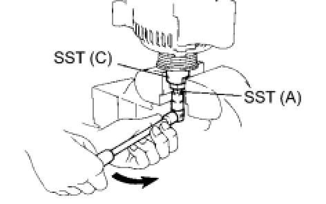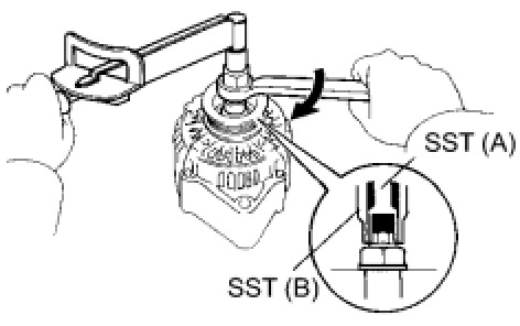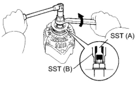 (a) Hold SST (A) with a torque wrench and tighten SST (B) clockwise to the specified torque.