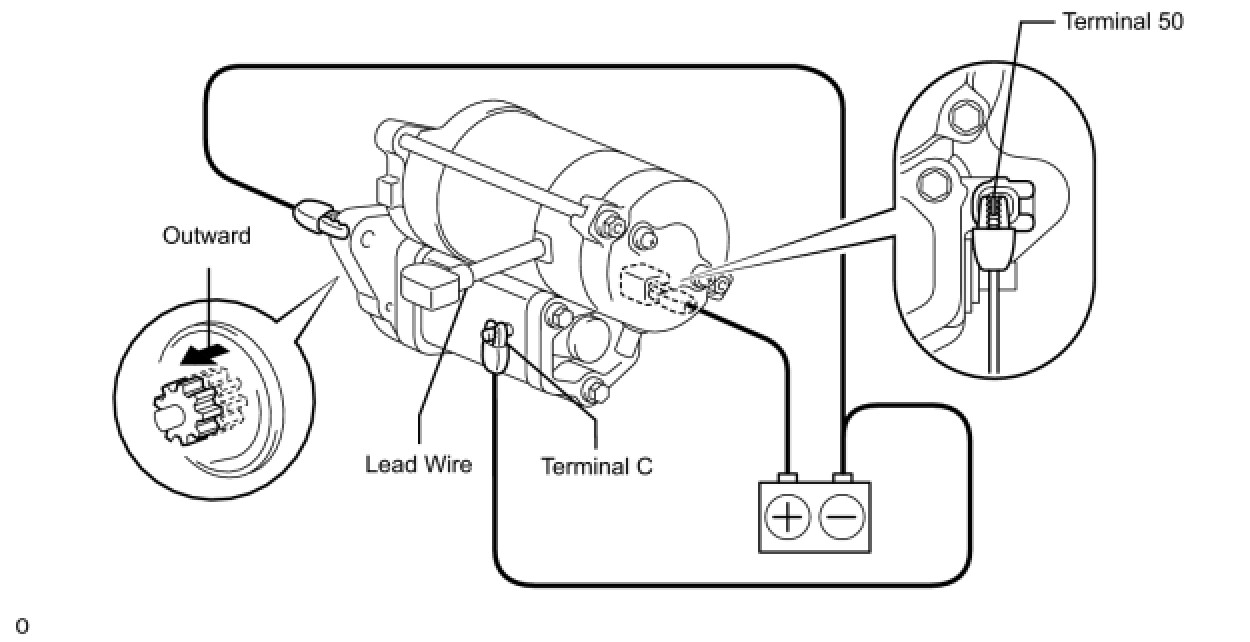 (3) With the battery connected as above and the clutch pinion gear out, disconnect the negative (-) lead from terminal C. Check that the pinion gear remains out.