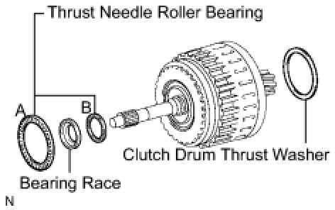 (b) Remove the clutch drum thrust washer, 2 thrust needle roller bearings and bearing race.