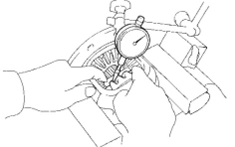(b) Place a dial indicator on the tip of the pinion gear tooth at a right angle. Hold the side gear in the differential case and check that the backlash is 0 mm (0 in.).