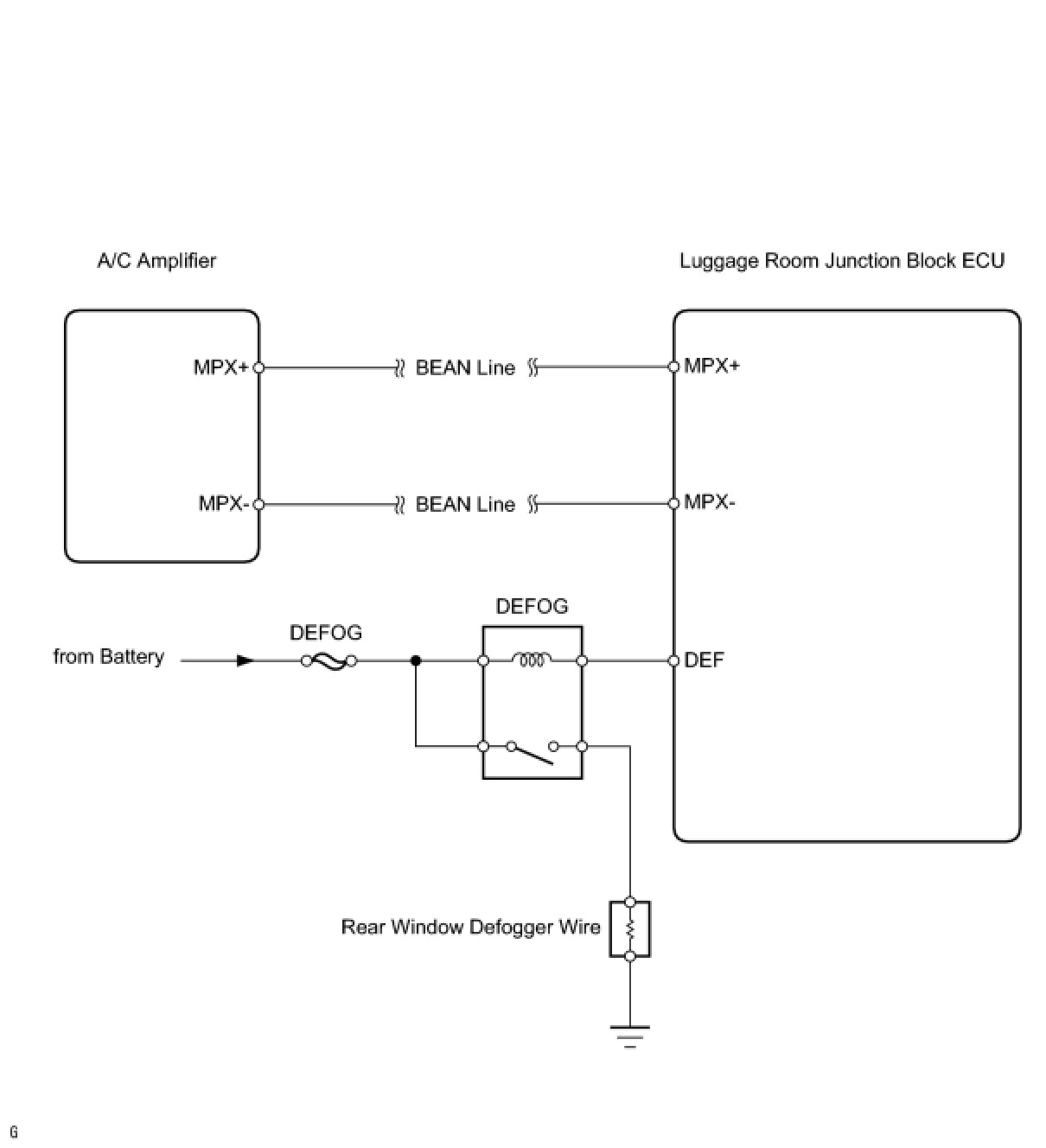 When the A/C amplifier defogger switch is pressed, a signal is sent via the BEAN line to the luggage room junction block ECU. Then the luggage room junction block ECU operates the rear window defogger.