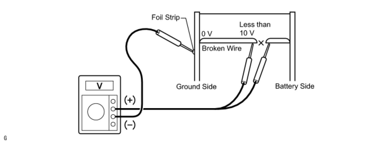 HINT: If the defogger wire is not broken, the voltmeter should indicate 0 V at the positive (+) end of the defogger wire. The voltage gradually increases to approximately 12 V as the lead moves to the other end.