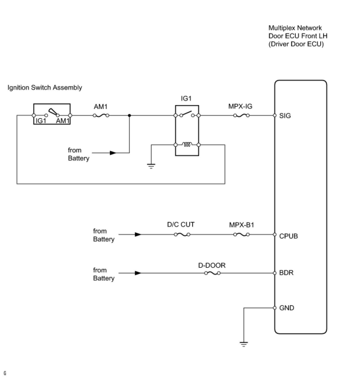 This circuit supplies power to operate the multiplex network door ECU front LH (driver door ECU).
