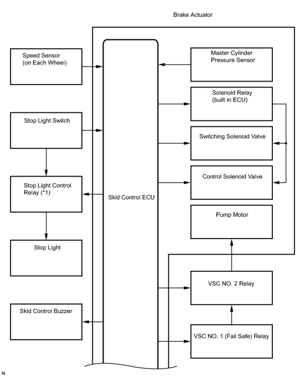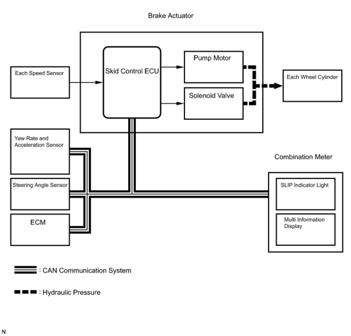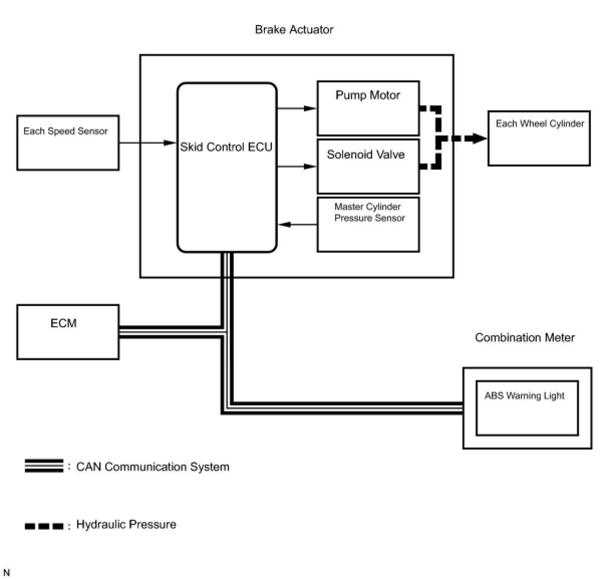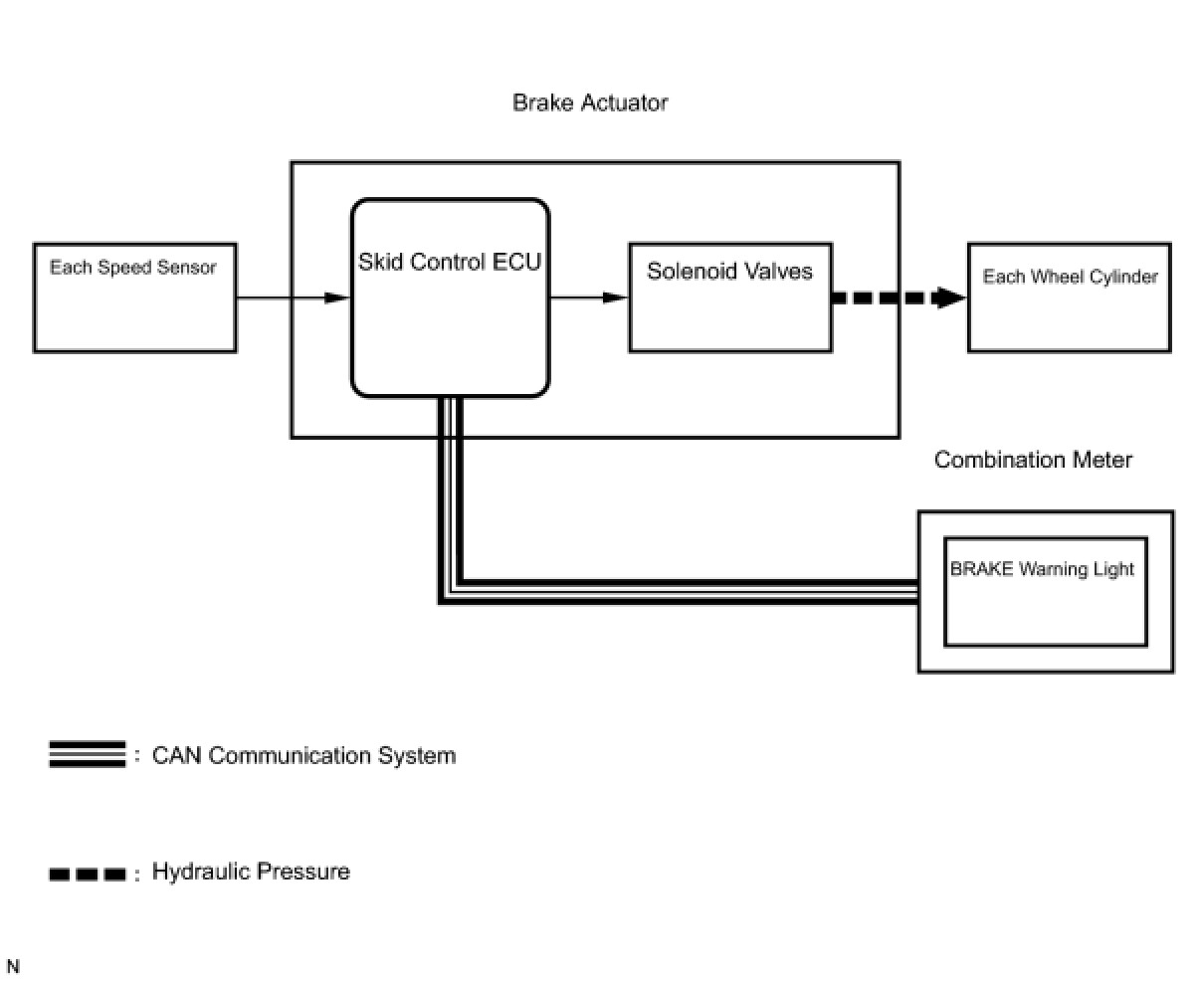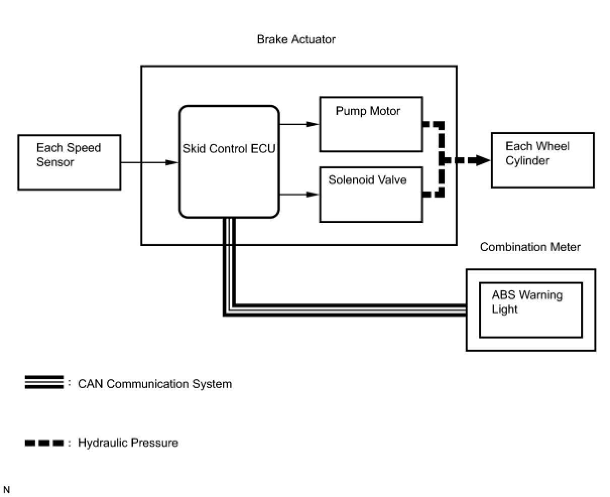 The skid control ECU receives a speed signal from each wheel speed sensor, and uses these signals to detect locking of the wheels. The ECU uses this information in order to determine appropriate control of the solenoid valves.
