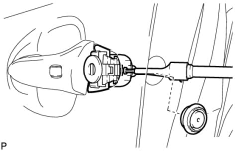 (b) Using a "torx" socket wrench (T30), loosen the screw and remove the front door outside handle cover and the door lock key cylinder as a unit.