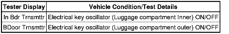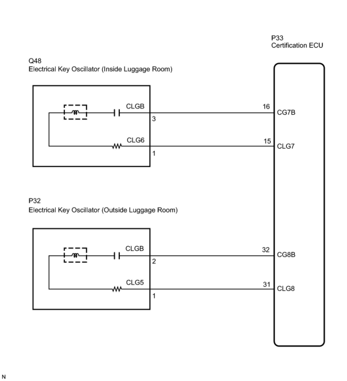 The certification ECU activates the inner and outer luggage compartment oscillators. The power is supplied from the certification ECU to both the inner and outer luggage compartment oscillators. The inner and outer luggage compartment oscillator circuits have the same wiring. If the entry luggage compartment function has a malfunction, check the circuit for a malfunctioning oscillator.