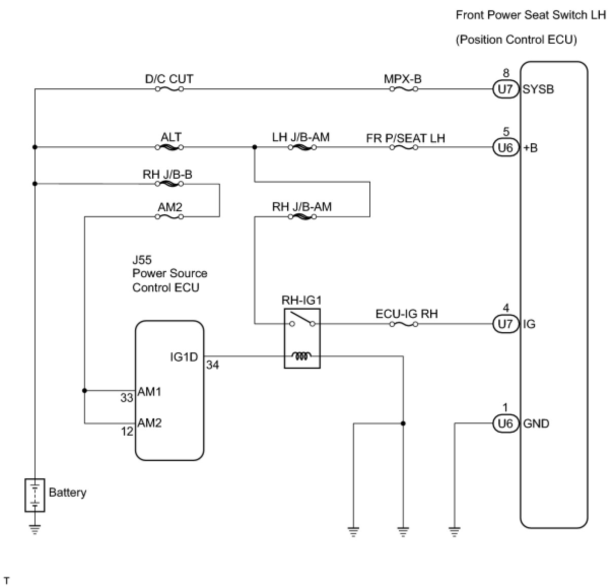This circuit is the power source circuit for the front power seat switch LH (position control ECU).