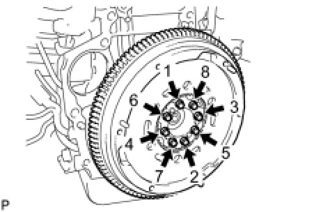* Do not reuse the flywheel installation bolts. Be sure to check the tightening torque within 5 minutes after tightening.