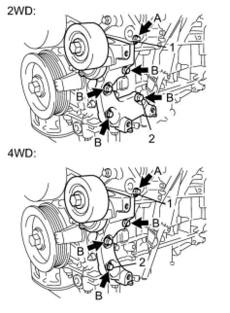 (c) Install the V-ribbed belt tensioner by tightening the bolt 1 and bolt 2 in the order shown in the illustration.