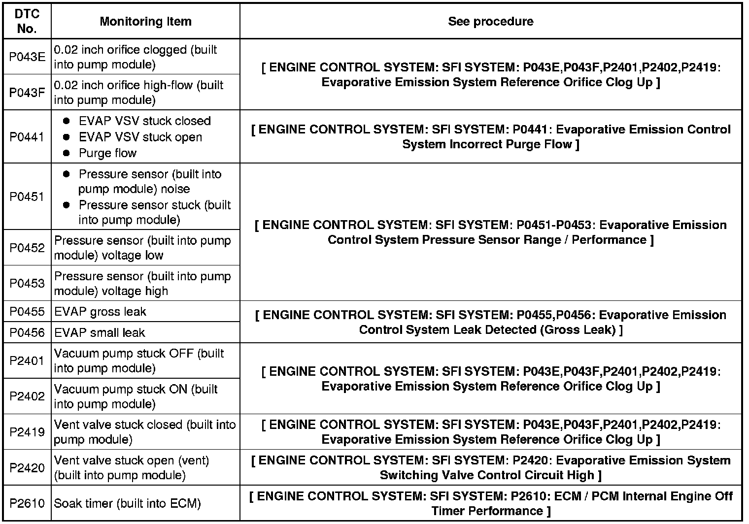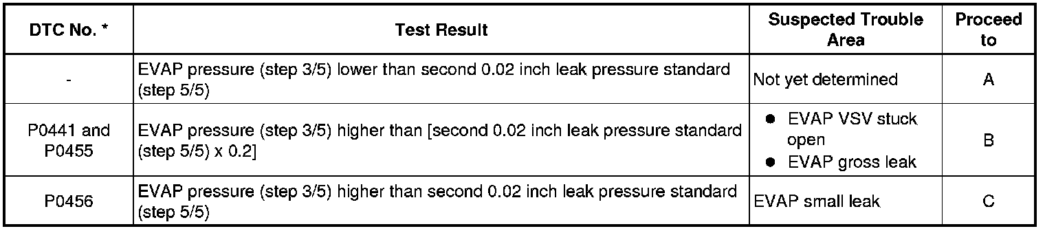 If the 0.02 inch reference pressure difference between the first and second checks is greater than the specification, the DTCs corresponding to the reference pressure (P043E, P043F, P0441, P0455, P0456, P2401 and P2420) will all be stored.