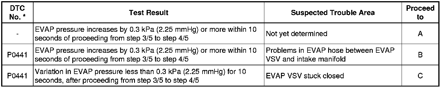 * The vent valve turned OFF (open) and the EVAP pressure is then measured. If the variation in the pressure is less than 0.5 kPa (3.75 mmHg), the ECM interprets this as the EVAP VSV being stuck closed, and illuminates the MIL and sets DTC P0441 (2 trip detection logic).