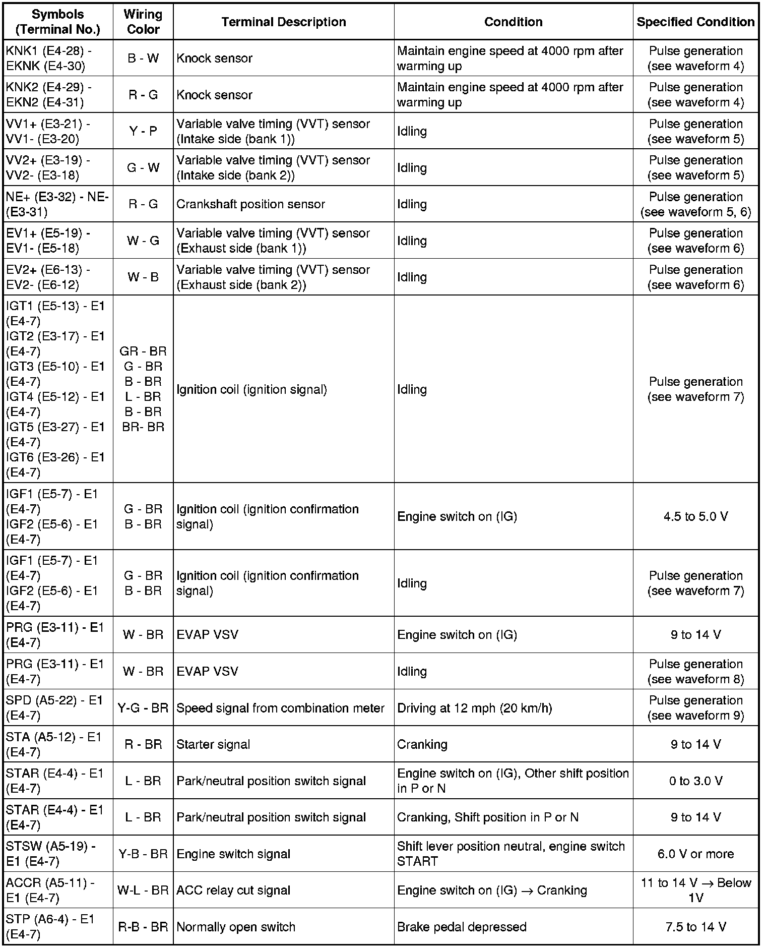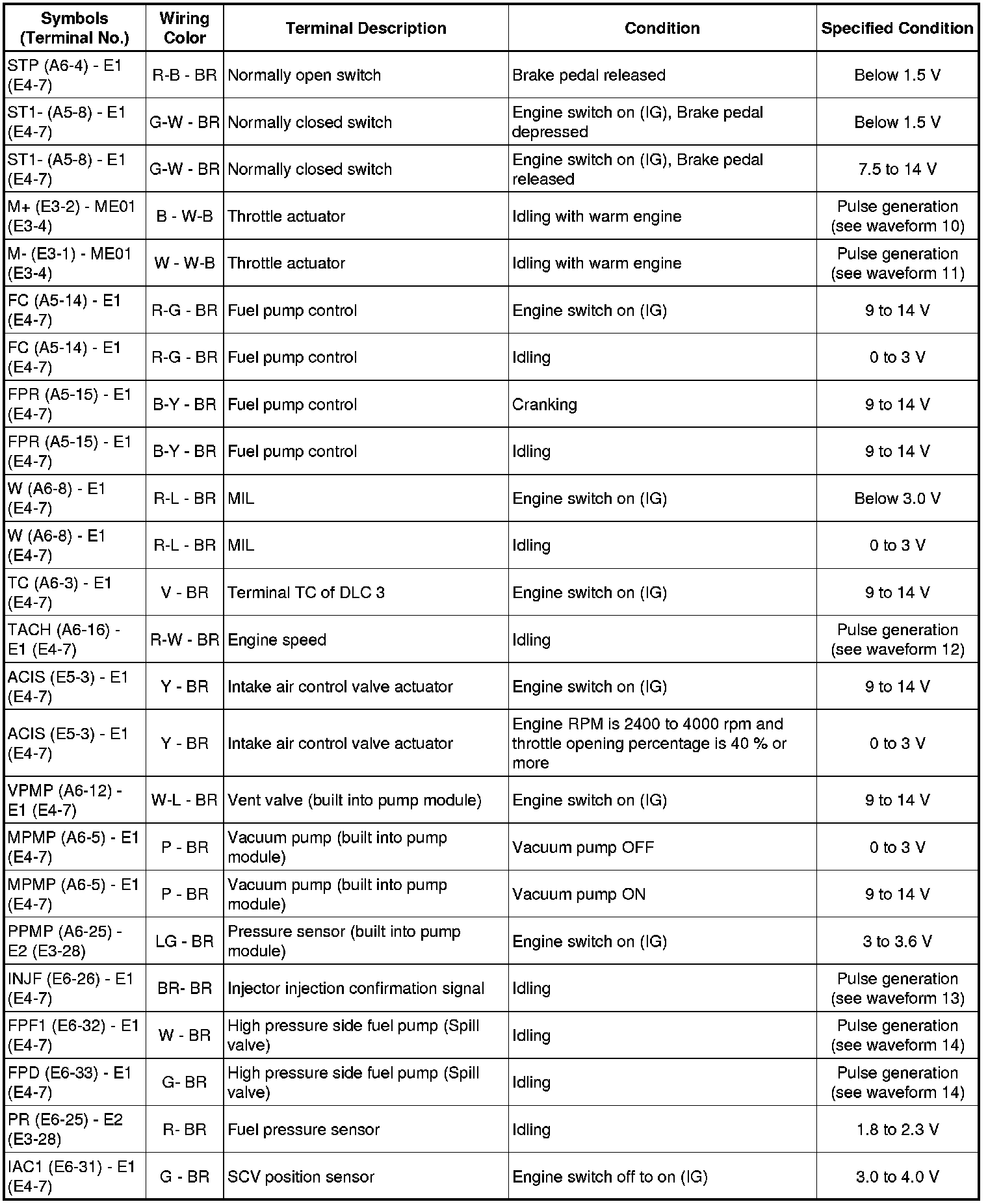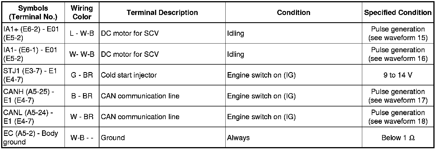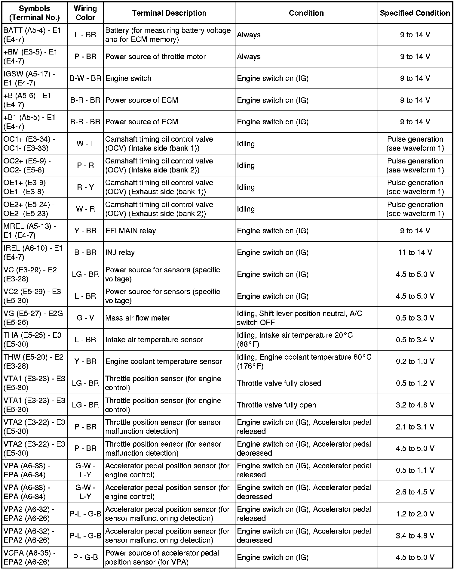 The standard normal voltage between each pair of the ECM terminals is shown in the table below. The appropriate conditions for checking each pair of the terminals are also indicated. The result of checks should be compared with the standard normal voltage for that pair of terminals, displayed in the Specified Condition column. The illustration above can be used as a reference to identify the ECM terminal locations.
