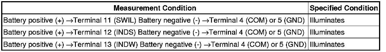 (c) Apply battery voltage between the terminals of the switch, and check the illumination condition of the switch.