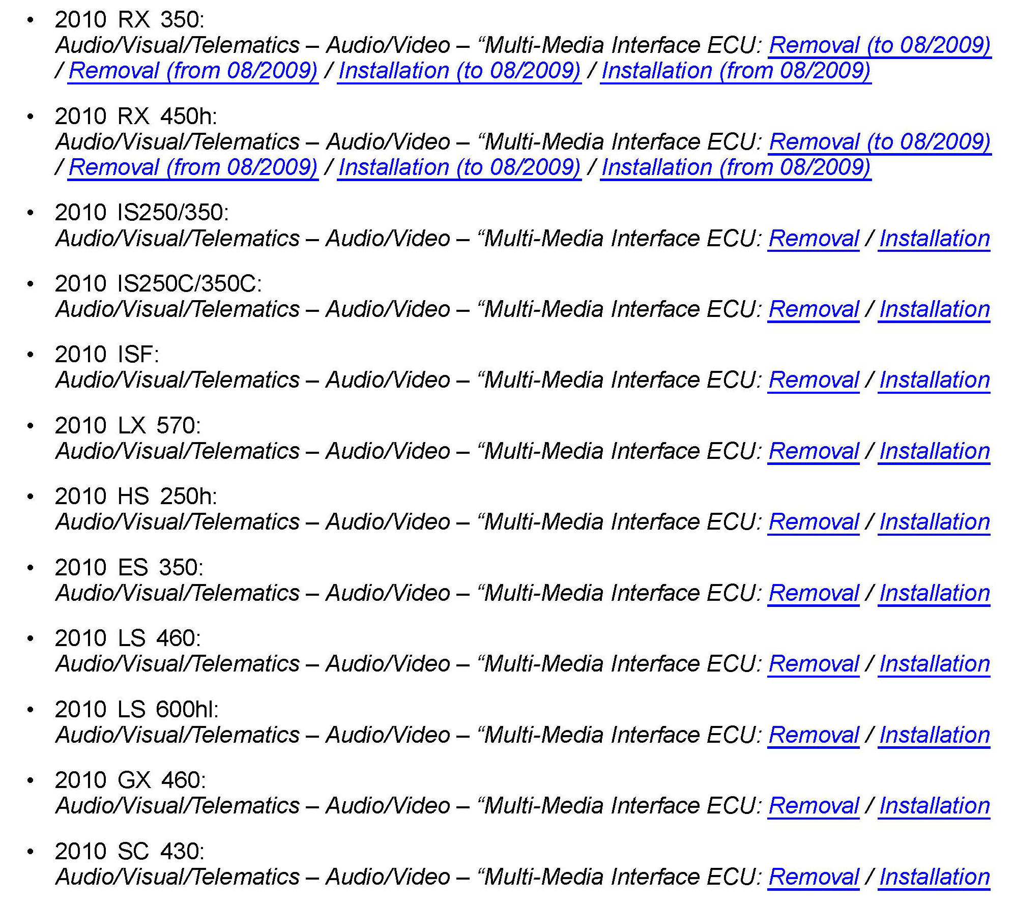 Some 2010 Lexus vehicles may exhibit an intermittent operation of USB/iPod(TM) device condition while in use. A newly designed Multi-Media Interface ECU has been developed to correct this condition. This bulletin applies to the following models: