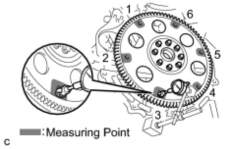 (a) Set up a dial indicator and measure the runout of the 6 portions around the torque converter fitting surfaces.