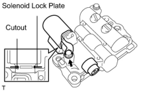 Install the solenoid lock plate into the cutout on the transfer control solenoid.