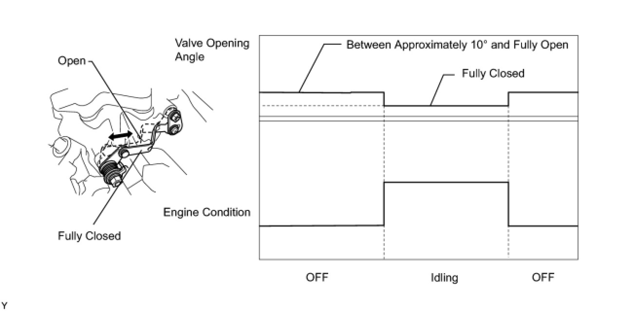 (3) After the engine switch is turned off again, confirm that the swirl control valve opens between approximately 10°and the fully open position.
