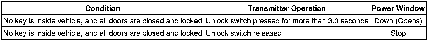 The power window moves down approximately 50 mm (1.969 in.). However, when the opening does not reach 200 mm (7.874 in.), the power window continues to go down until the opening reaches 200 mm (7.874 in.) or until approximately 5 seconds elapse.