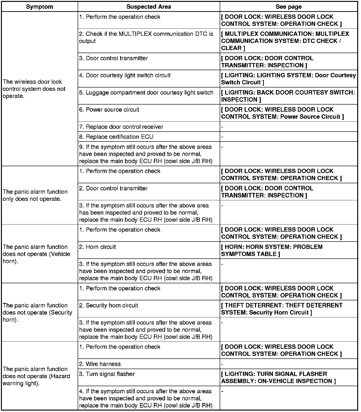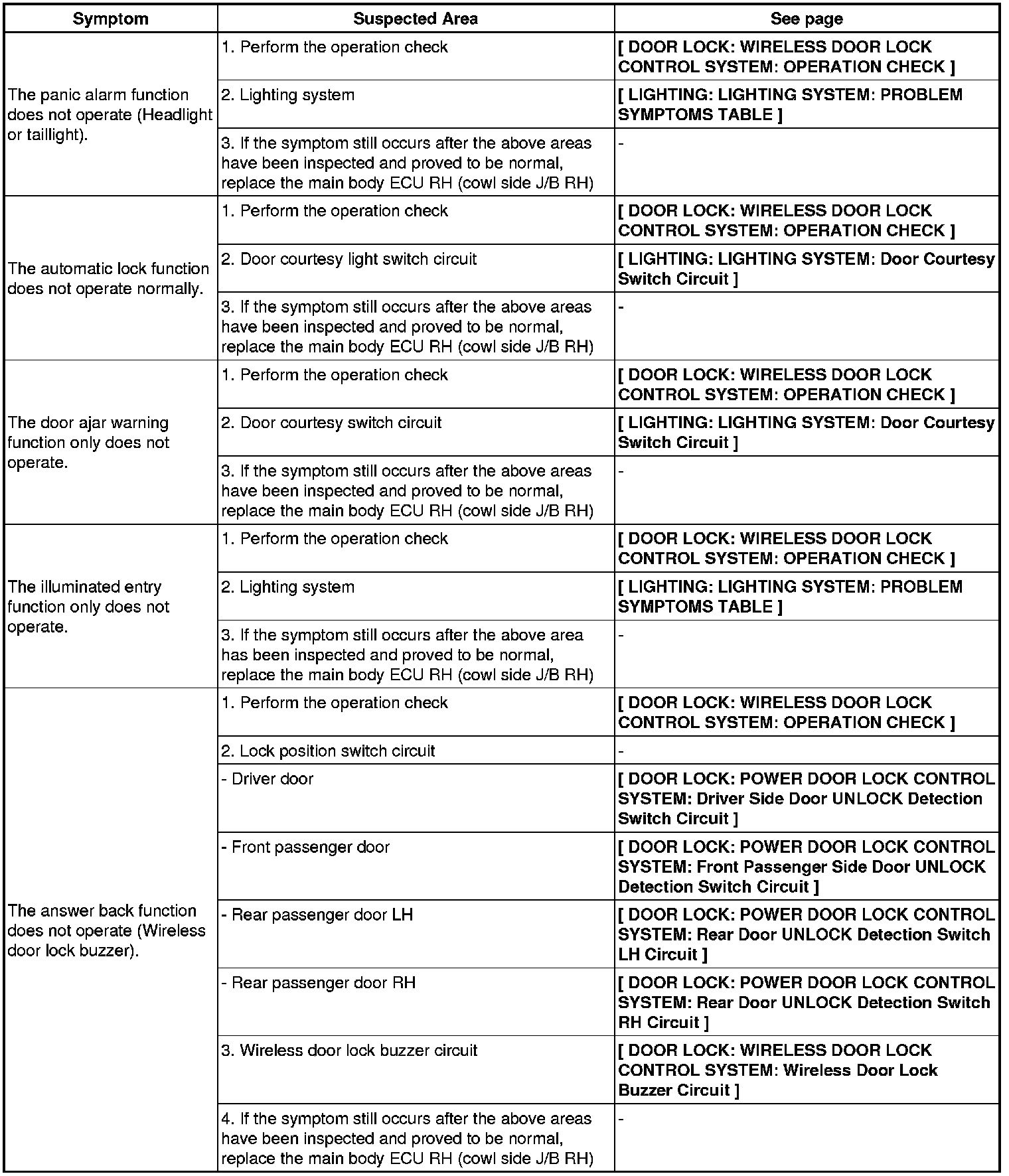 DOOR LOCK: WIRELESS DOOR LOCK CONTROL SYSTEM: PROBLEM SYMPTOMS TABLE