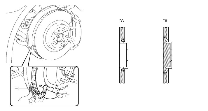 (c) If the runout exceeds the maximum value, change the installation positions of the disc and axle so that the runout will become minimal. If the runout exceeds the maximum even when the installation positions are changed, check the bearing play in the axial direction and the axle hub runout Front Axle Hub. If they are normal, and if the disc thickness is not within the specified range, grind the disc. If the disc thickness is less than the minimum, replace the disc.