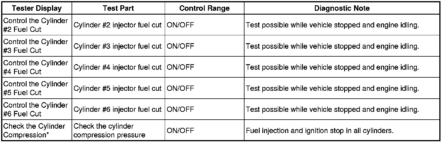 *: When cranking the engine, each cylinder measures the engine rpm. In this Active Test, the fuel and ignition of all cylinders are cut, and cranking occurs for approximately 10 seconds. Then, each cylinder measures the engine rpm. If a cylinder's engine rpm is higher than the others, that cylinder's compression pressure is compared to the others, and is determined whether it is low or not.