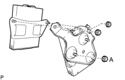 (c) Insert loosely tightened nut A into the hole on the vehicle body (left side of the luggage compartment). Slide down the seat belt control ECU and the clearance warning ECU as a unit to temporarily install them.