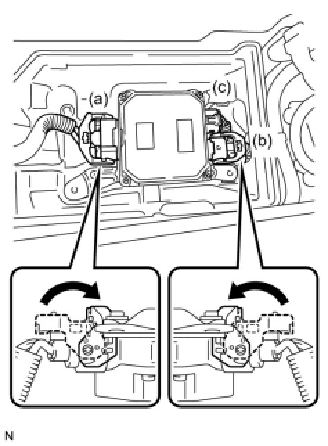 (c) Release the locks of 2 power steering ECU assembly connectors (a) and (b) and disconnect the connectors.