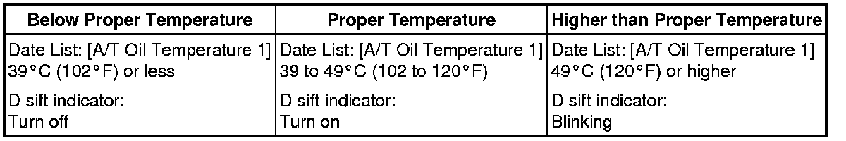 * If the fluid temperature is below 49°C (120°F), proceed to the next step. (Recommended ATF temperature 39°C (102°F) or less.)