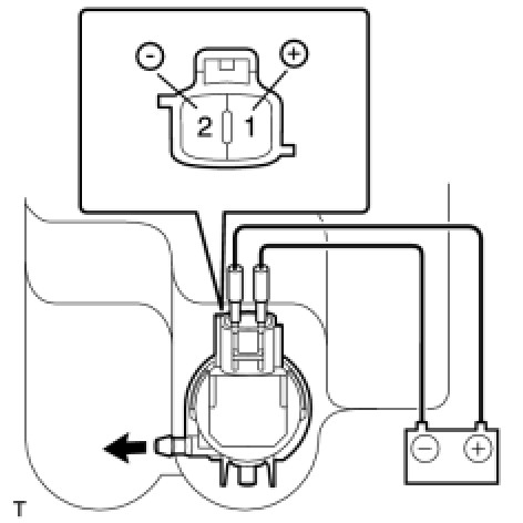 (b) Connect the positive (+) battery lead to terminal 1 of the headlight cleaner motor and pump, and the negative (-) lead to terminal 2.