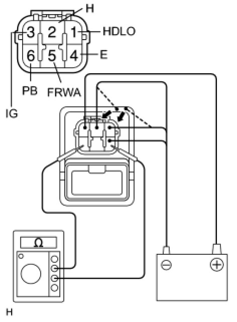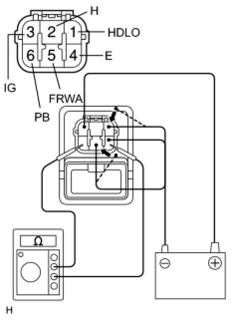 (6) Connect the negative (-) battery lead to terminals 1 (HDLO) and 5 (FRWA), and measure the resistance between terminals 4 (E) and 6 (PB).