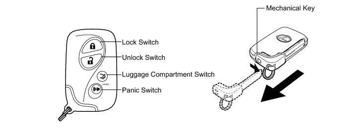 Push the lock switch, unlock switch, luggage compartment switch and panic switch on the key to operate each function. For details, Operation Check.