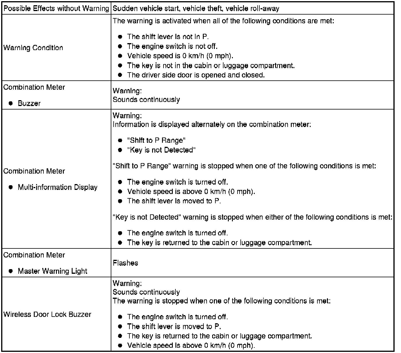 * Pattern 2: Under the conditions of pattern 1, the driver closes the door and attempts to leave the vehicle while holding the key.