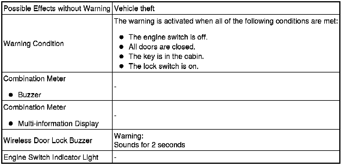 (d) If the key is located inside the cabin, the door lock function will not operate and the alarm buzzer (beep sound) will sound for 2 seconds.