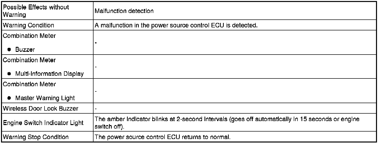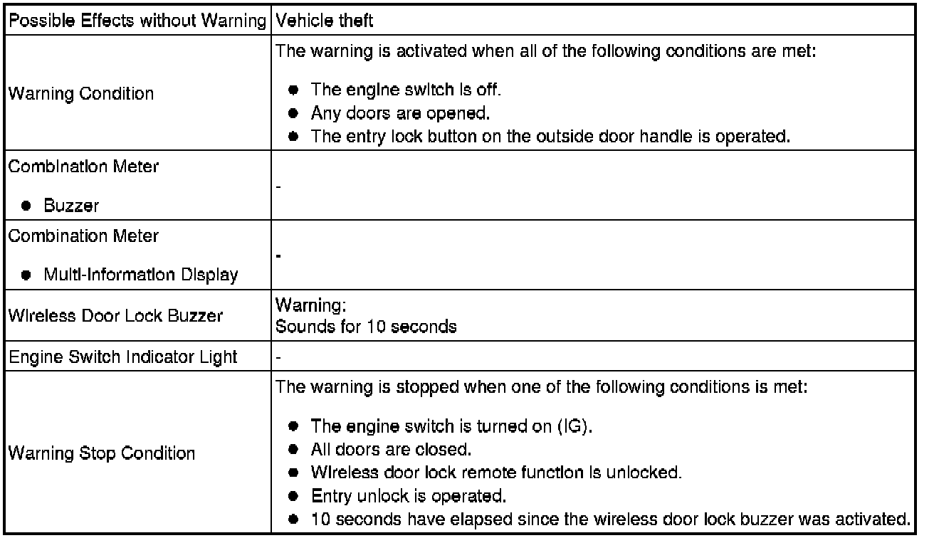 When any of the situations below occur, the smart access system with push-button start causes the certification ECU (smart key ECU assembly) to sound the buzzer in the combination meter and the wireless door lock buzzer, and a message to appear on the multi-information display in order to alert the driver.