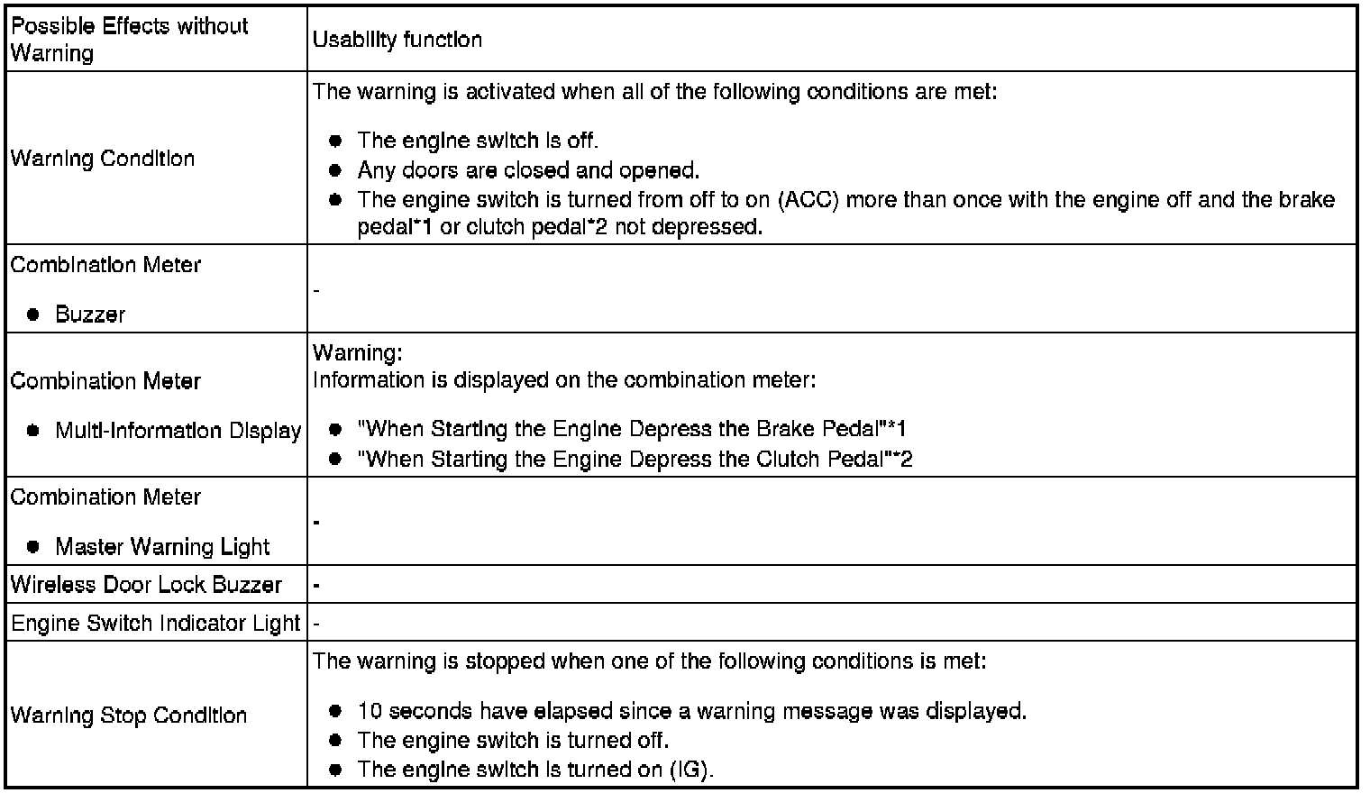 * Pattern 1: When the driver door is open, the driver turns the engine switch on (ACC) and attempts to leave the vehicle.